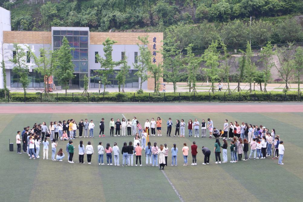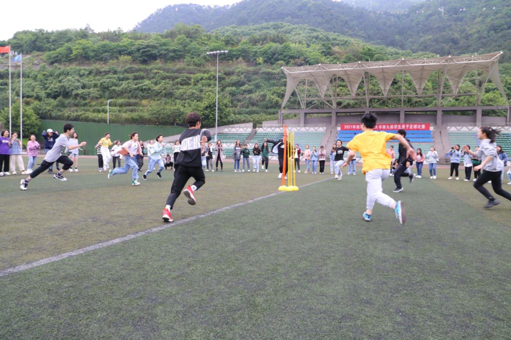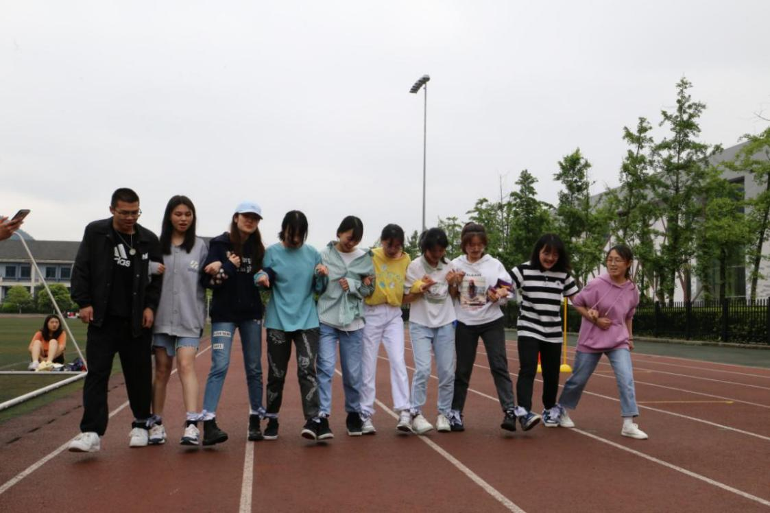 在十人九足项目中,每组人,每两人的脚缠在一起,需要队员通过默契配合来穿过弯道再进入直道,让同学们充分体会到了团队合作的重要性。