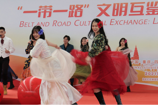 在国际文化节开幕式中,国教院师生带来了歌舞《Mambo Italiano》,该节目由丁欢老师创作编导,国教院师生和大学生艺术团同学身着带有异域风情的服饰,欢快的旋律,热情的舞蹈瞬间点燃了现场气氛。