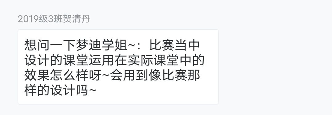 首先,邱梦迪与各位学弟、学妹们分享了竞赛活动对成为一名新手教师的重要性。一是同学们可以通过比赛丰富自己,不断累积经验二是比赛可以提高简历的含金量和可读性,不断打磨自己的专业技能三是通过比赛提升自己的协调沟通能力,不断挑战、提升自我四是透过比赛完善自我,不断与队友、竞争者磨合,共同进步同时邱梦迪给学弟、学妹们提出以下三点建议:第一,合乎中道的看待自己,金无足赤,人无完人;第二,调整心态从目标导向转变为过程导向,注重实践的过程;第三,学会反思,总结经验,反思不足,归纳长处。