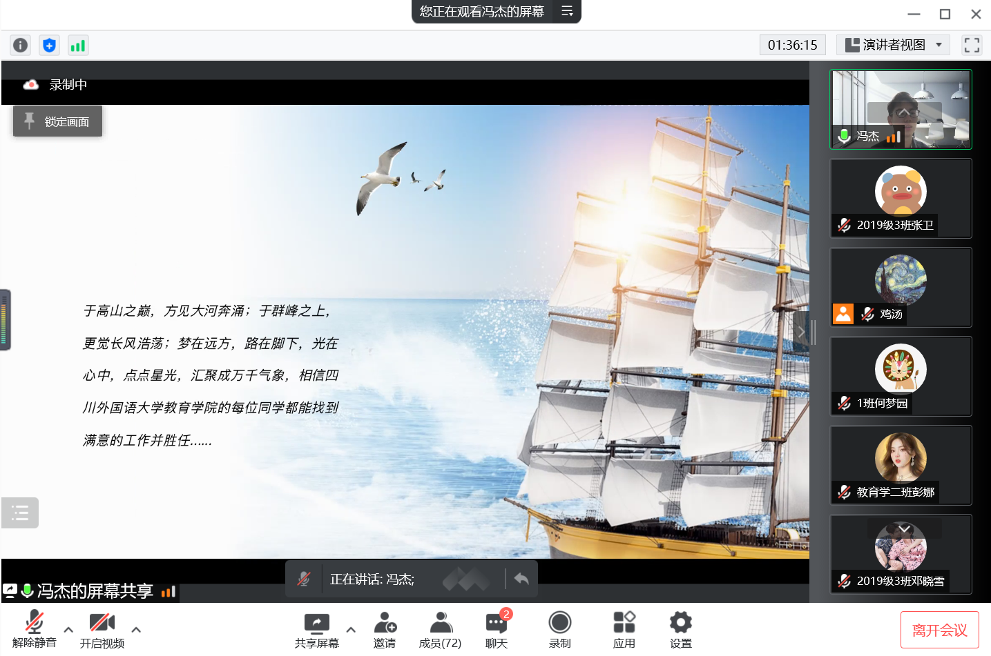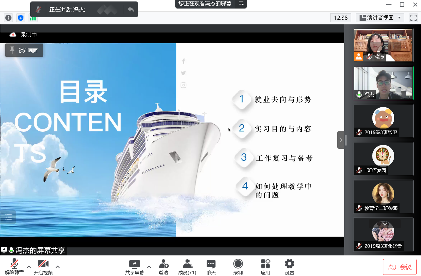 接着冯杰老师以学长身份与大家分享了昔日在川外度过的快乐学习时光,并从以下四个方面分享了学业、就业方面的规划。第一,有关于教育学专业的就业去向。冯杰老师以自身的亲身经历讲述了当前中小学学生和学情特点,建议同学们及时关注当下的学生情况。第二,教育实习的目的。冯杰老师谈到实习就是将理论与实践相结合,实习中不断提升自己的动手能力,提前适应工作岗位。第三,求职的复习与备考。冯杰老师分享了入职中小学的途径与方法。一是参与事业单位教师招聘考试。二是参加农村义务教师招聘考试(特岗),但所有考试或招聘都需要以自身过硬的能力为基石第四,人际交往及人际关系的处理。实践过程中,课堂上会遇到一些突发情况,我们应该要增强自己的主人翁意识,多建立与各主体相互交往的关系,作为老师,我们要不断学习、反思和创新自己的课堂。