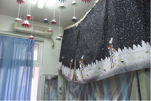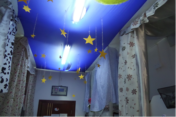 充满了星光的宁谧,神秘又令人遐想,仿佛置身于浩渺的银河中,浪漫宁静。各具风格的床帘展示了同学们不同的性格色彩,碰撞出不同的火花。她们的主题是“stary  stary night”。