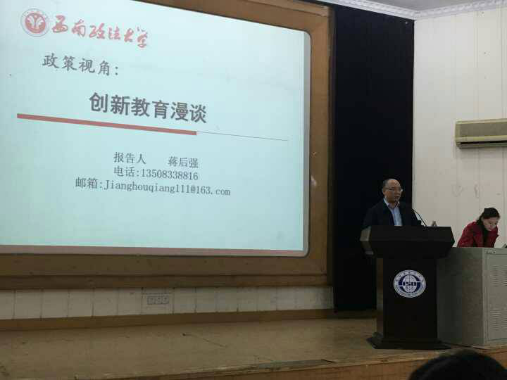 然后,蒋后强教授对“创新”二字进行了剖析:“创”即剖开;“新”即从斤,从木,辛声。即创新就是观念的更新,形成新产品或新工艺,对原有物品的改进或改变。他还提出了创新有五个特点:一、创新是在生产过程中产生的;二、创新是一种“革命性”变化,意味着旧的毁灭新的产生;三、创新必须能够产生出新的价值;四、创新是经济发展的本质;五、创新的主体是“企业家”。其次,他对创新教育做了如下定义:创新教育就是通过教育自身的改革,教会学生创新技术,形成学生创新能力的教育,关键是想法不同,并能实践,创是方法,新是结果。