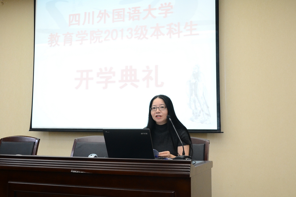 在精彩别致的开学典礼上,殷和素院长首先代表教育学院全体教师向各位新同学表示热烈的欢迎与祝贺。在介绍教育学院历史时,她讲到,虽然教育学院是20135月才正式成立,但川外的师范教育由来已久,有着深厚扎实的基础,已形成了从本科教育到研究生教育的一体化教育学科发展格局。作为教育学院首届本科生,学院将全力以赴,把同学们培养成“专业好,外语优”的高素质教育人才。