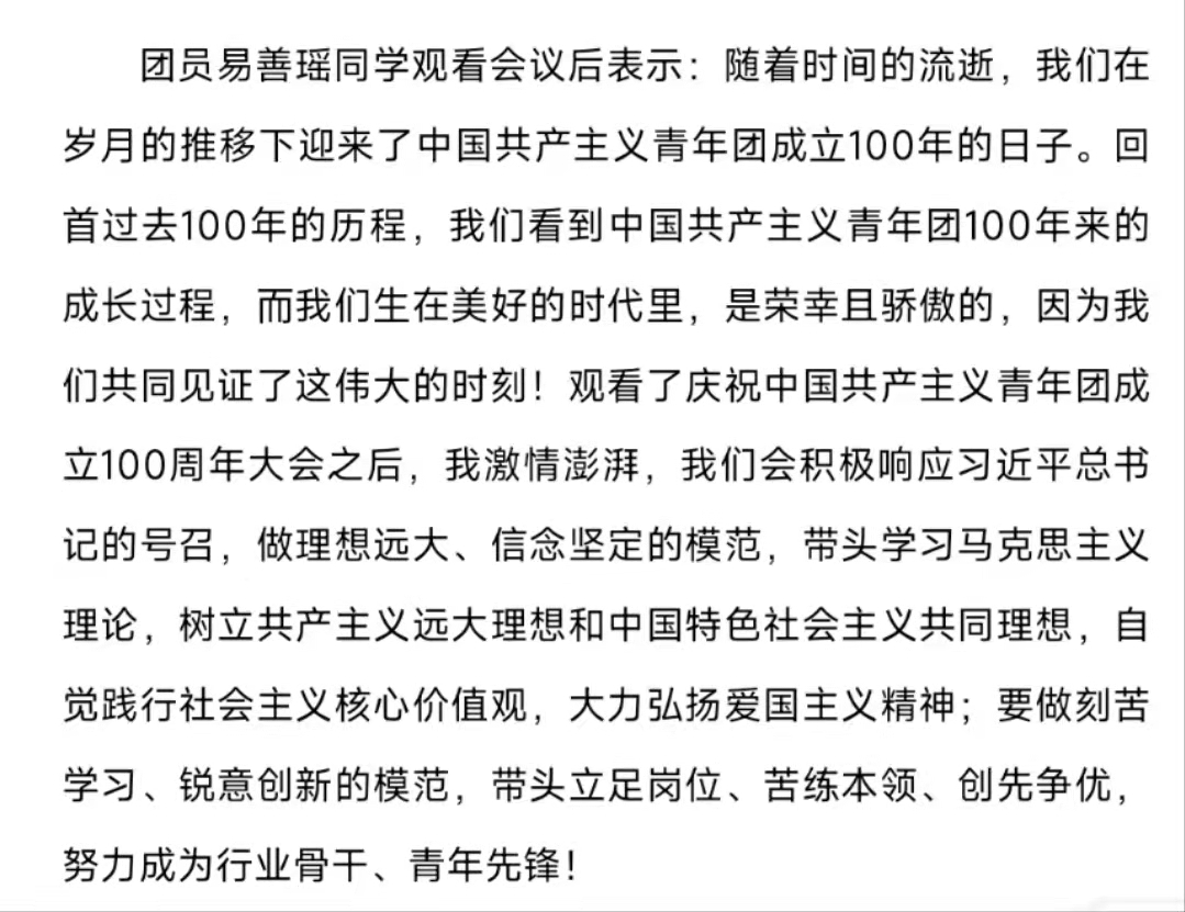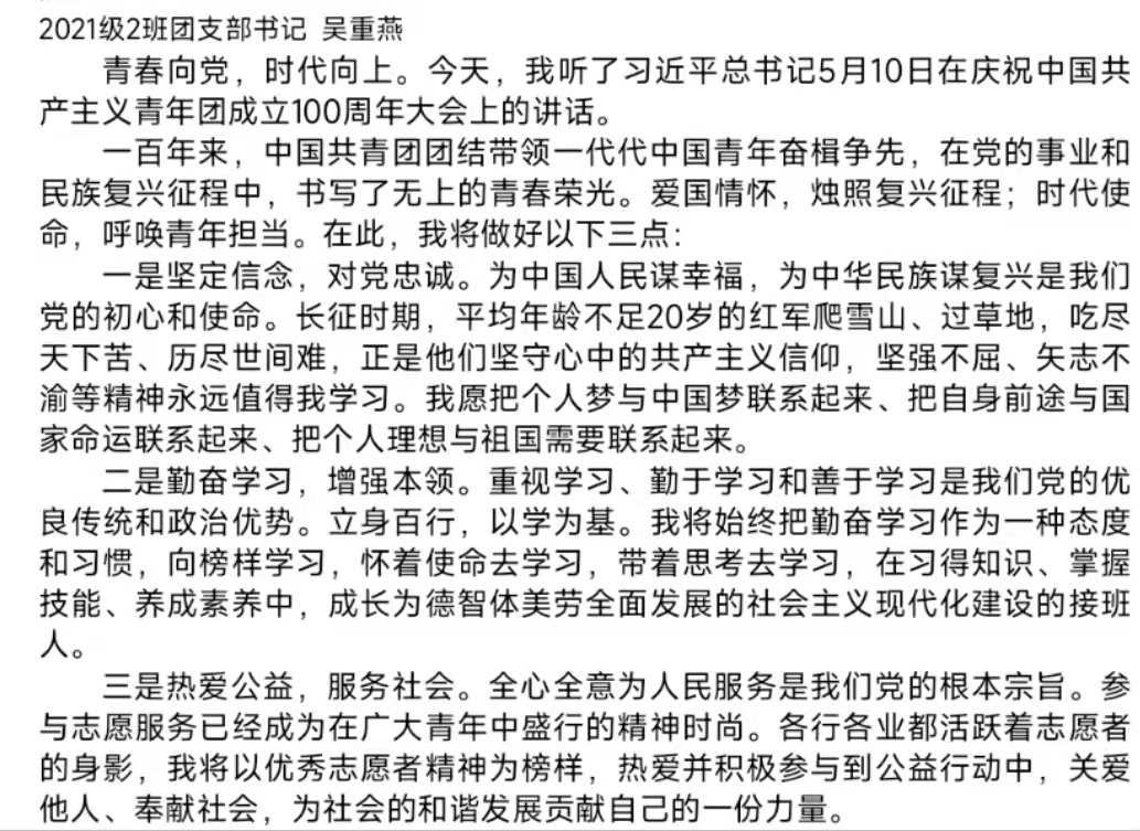 百年征程浩荡,百年初心如磐。今年是中国共产主义青年团成立100周年,一百年栉风沐雨,中国共产主义青年团始终坚定不移跟党走,团结、带领广大青年前赴后继、勇当先锋,书写了中国青年运动的华章。中国共产主义青年团是中国共产党领导的先进青年的群团组织,是广大青年在实践中学习中国特色社会主义和共产主义的学校,是中国共产党的助手和后备军,是党联系青年的桥梁与纽带,也是党和人民事业的主力军和突击队。习近平总书记在大会上对青年表达了高度赞赏,并寄予了殷切期望。同学们通过撰写青年热议信息的方式,表达了自己对青年精神、共青团精神等的领悟与感想,并将深入贯彻习近平总书记重要讲话精神,展现爱党向党之心与青年之朝气蓬勃。