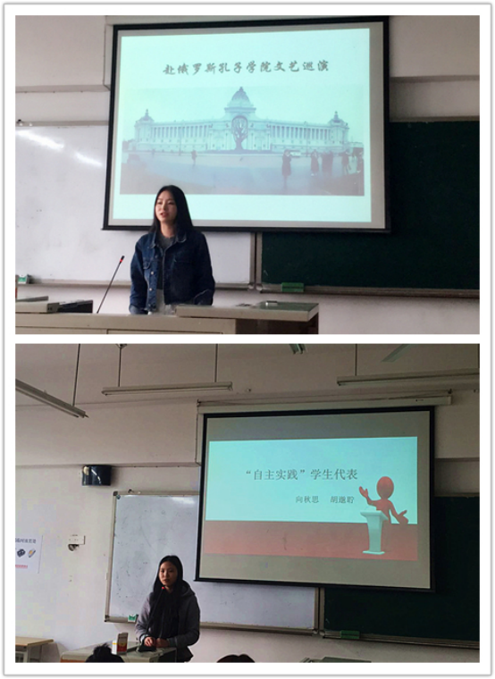 除此之外,凌鹭同学还分享了自己本学期接受中国汉办委派,代表太阳成集团官方网站参与了赴俄罗斯孔子学院巡演,传播中国优秀传统文化、非物质文化遗产的经历;向秋思同学暑期担任实习老师,实践了自己所学的专业知识;李坤丽同学于去年暑假赴台湾参加的孔子行脚活动的精彩经历也格外吸引同学们。
