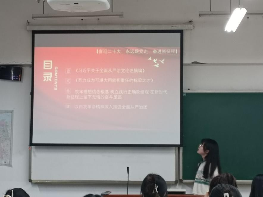 接下来,团总支副书记贺清丹带领参会人员针对《团干部“六查六问”专项行动学习资料汇编》中《习近平关于全面从严治党论述摘编》《努力成为可堪大用能担重任的栋梁之才》以及习近平总书记在2022年春季学期中央党校(国家行政学院)中青年干部培训班开班仪式上的讲话,贺军科同志在共青团十八届六中全会第一次全体会议上的主题报告等篇目的相关内容进行集中学习。