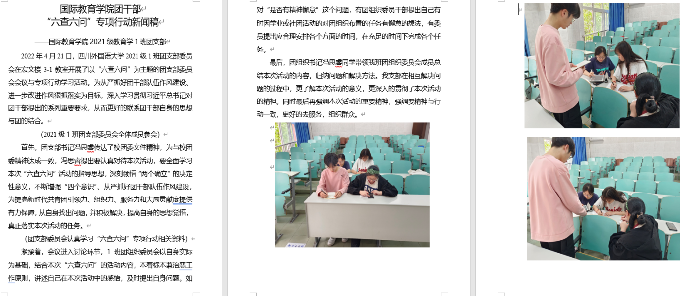 最后,贺清丹同志对此次专题活动的主要精神进行了总结,全体团干对相关材料进行了集体撰写。会议强调,开展“六查六问”专项行动,要紧扣共青团的根本任务、政治责任和工作主线,努力实现团干部政治上要强、思想上要强、能力上要强、担当上要强、作风上要强、自律上要强的工作目标,促进团干部作风进一步改进、精神进一步提振、能力进一步提升,以优异的成绩迎接党的二十大胜利召开。