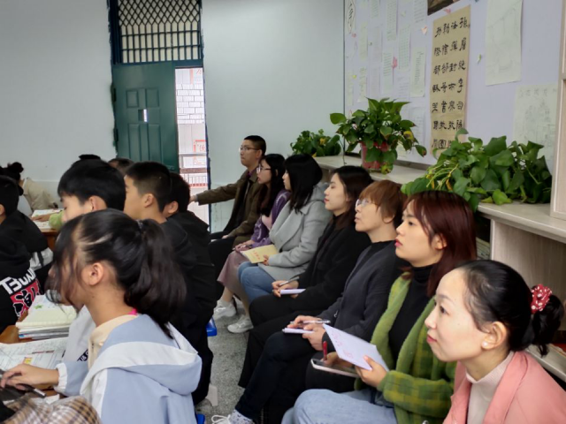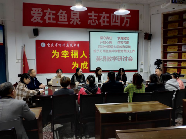 接着,我院老师和鱼泉中学英语教师进行了交流会,会议由彭校长主持。首先,彭校长表达了对我院在当前鱼泉中学因转型造成学科结构性缺编,尤其是英语教师差缺的情况下,派送教师前来支援的感激之情。之后,听课教师纷纷发言。我院老师提出的不少全新教学理念、教学方法深受鱼泉中学老师们的赞同。在各抒己见的交流后,大家在其乐融融的氛围中结束了本次座谈并合影留念。
