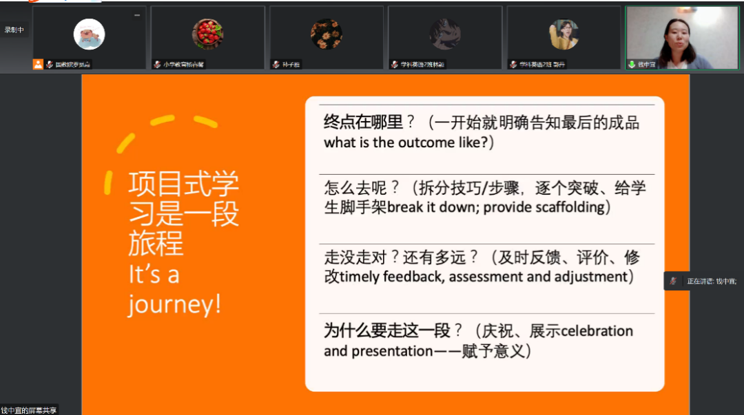 首先,钱老师介绍了项目式学习设计的核心思路——“以终为始”,建议大家以“产出结果倒推”的方法梳理各阶段教学目标与学习要求。然后,钱老师列举了“英语”、“数学”、“跨学科”等3个项目式学习案例,用生动的语言展示了目标、设计、学习、反馈的全过程。最后,钱中宜老师介绍了如何在项目式学习过程中及时引导与评价的方法。
